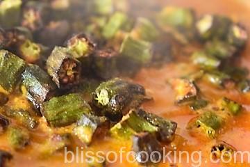 - Add the bhindi, stir and then lower the heat and cook till the bhindi is tender.