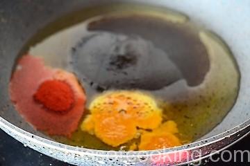 - Heat oil in a pan; add turmeric, red chilli and saute for a few seconds, taking care not to burn the spices.