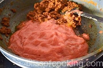 - Add the tomato puree, onions and saute till the masala is dry.