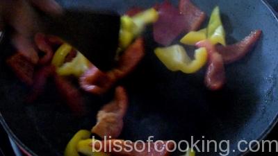 - Heat a pan; add ½ teaspoon oil and saute both the capsicums on high heat by adding a pinch of salt and dry herbs.