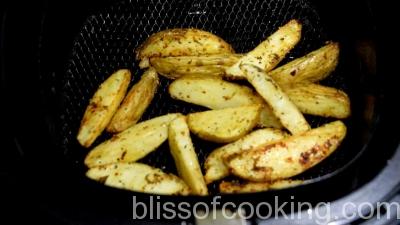- Air fry or deep fry the potato wedges and set aside.