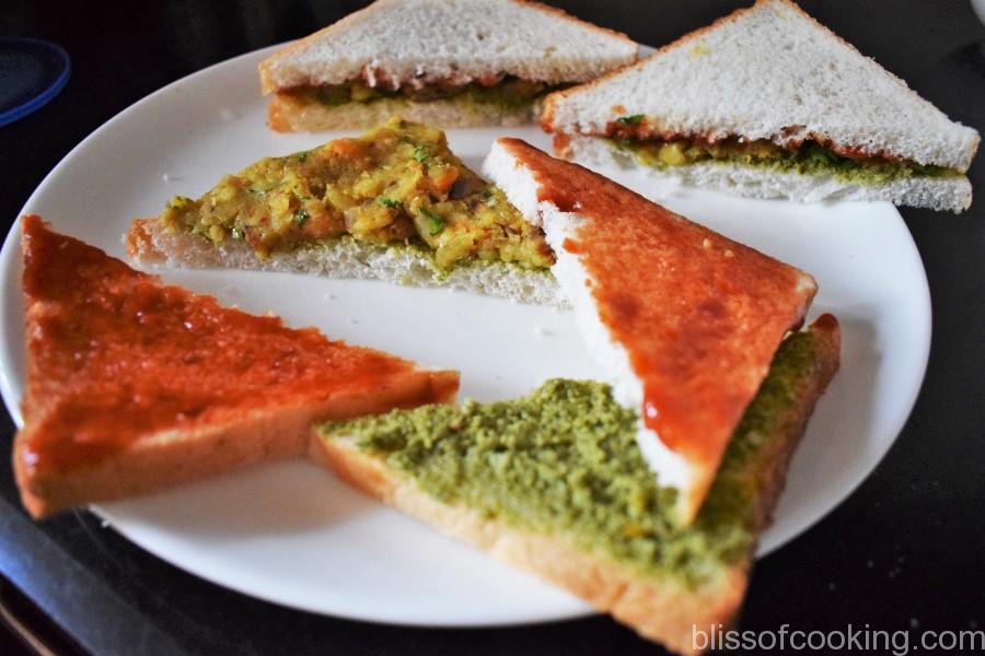 - Cut the bread slices into two diagonally. Apply green chutney on 4 pieces and tomato ketchup on the rest on one side only.