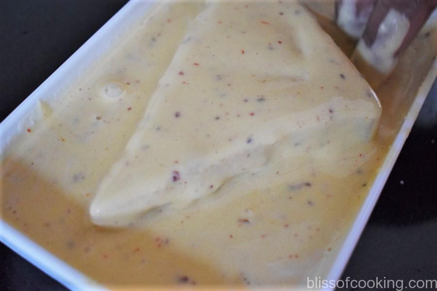 • In a bowl mix all the ingredients mentioned for the batter. Make batter of medium consistency by adding water gradually as required. Stir well so that there are no lumps. Set aside.