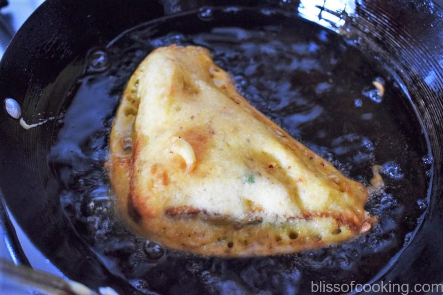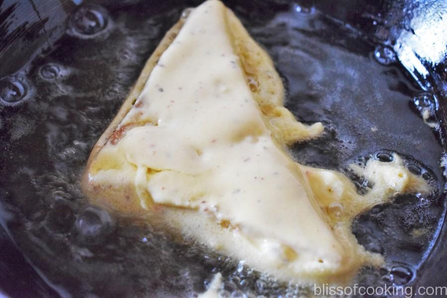 - Dip in the besan batter to cover all the sides and fry in medium hot oil till golden.