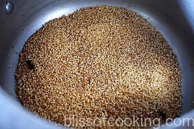 • Heat ½ teaspoon ghee in a pressure cooker; add cardamoms, cloves, dalia and saute on low heat till golden.
