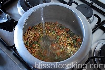 - Now add water, give a stir. Pressure cook on medium heat till one pressure then lower the heat and cook for 10 minutes.