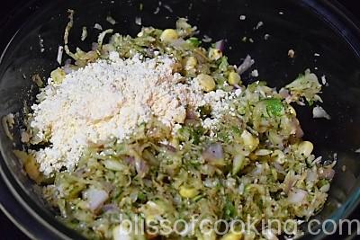 - Now add chickpea flour, salt and mix. Adjust the quantity of flour accordingly so that the mixture is not too moist and it is easy to handle.