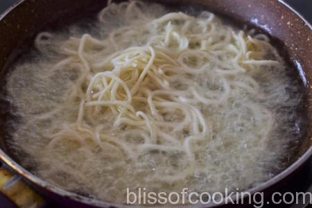 • Heat sufficient water, add  salt and one teaspoon of oil and bring to a boil. Add noodles and boil on high heat until 75% cooked.