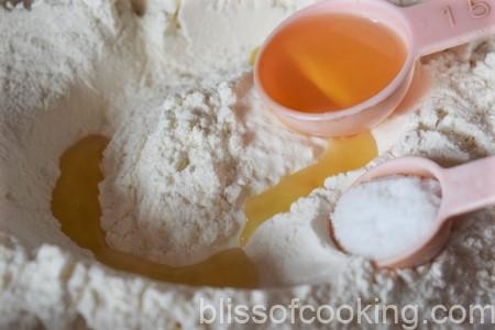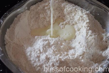 - In a large bowl add 2 cups maida, salt, sugar, 1 tablespoon oil and mix. Now add milk and make soft dough by adding water as required.