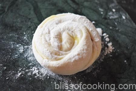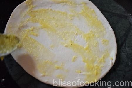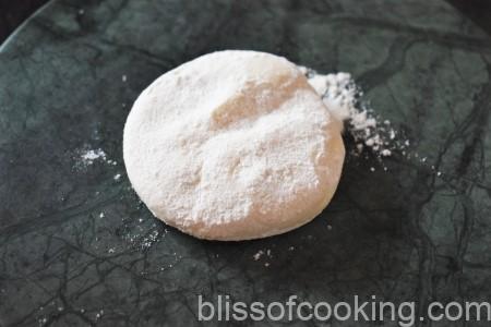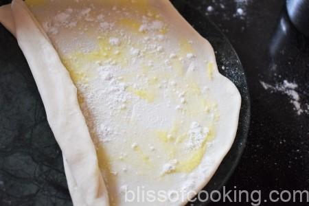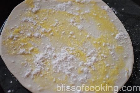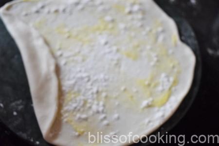 - Roll out each ball into thin chapati. Apply ½ teaspoon ghee or oil and sprinkle flour evenly on top.