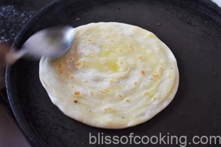 - Heat a gridle on medium heat, place the paratha and let small bubles appear. Flip the porotha and apply ghee and flip again and apply ghee on this side also. Cook till light pink and crisp.