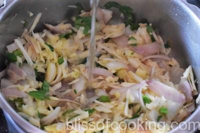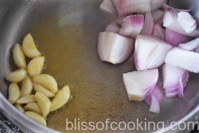 - Heat a of spoon oil in a pot, add garlic, onions and saute till soft.