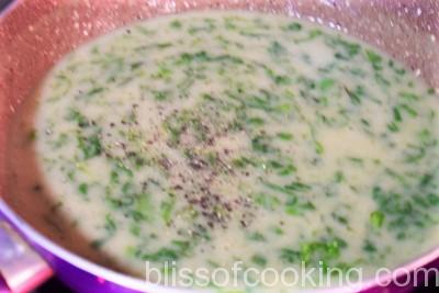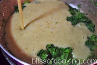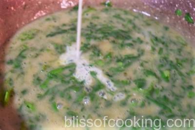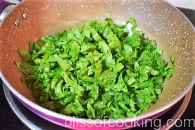 - Heat rest of the oil in the same pot, add spinach and saute till it shrinks. Pour in the pureed vegetables and let it come to a boil.