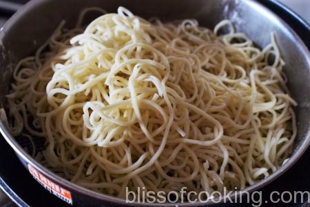 • Strain and set aside till water has drained completely. Add 1 teaspoon oil and toss. Divide the noodles into 4 batches to fry.