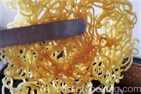 • Heat oil for frying in a pan, sprinkle a little plain flour on the noodles and carefully place in oil in such a way to form a nest. Do not stir. When the nest is firm enough then turn and fry till crisp. Drain on absorbent paper and set aside.