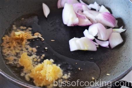 • Heat oil in a pan, add ginger, garlic and saute for just 15 secs on high flame.