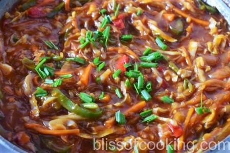 • Cook the gravy for 2 minutes till it becomes little thick. Switch off the heat and add spring onion greens.