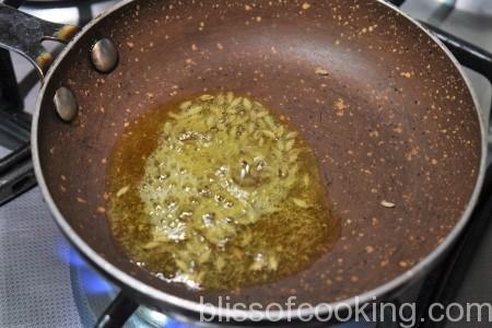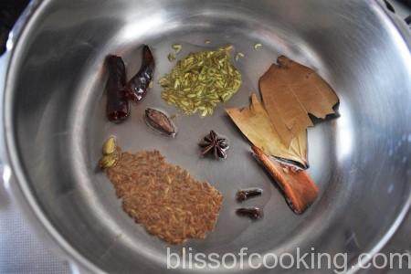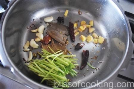 • Heat oil in a pressure cooker, add jeera, saunf, tej patta, green cardamoms, black cardamom, cloves, cinnamon, star anise and red chillies and sauté till fragrant.