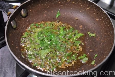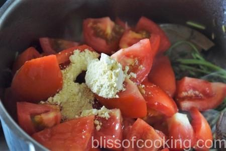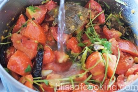 • Add tomatoes, coriander stem, besan and saute for 1 minute.