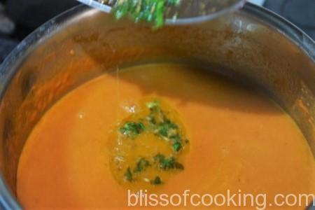 • Heat ghee in a pan, add cumin seeds and as they start to crackle add half of coriander leaves. Stir for 1 minute and then pour it on the soup. Switch off the heat.