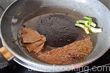 • Heat oil in a pan; add jeera (cumin), bayleaf and green chilli.