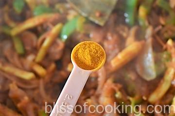 • Now add turmeric powder, chilli powder, coriander powder, garam masala, salt and saute until oil separates.