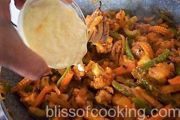 - Add cream and mix. Add lemon juice, cover and cook till the vegetables are cooked but do not lose the crunch. Switch off the flame.