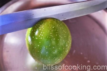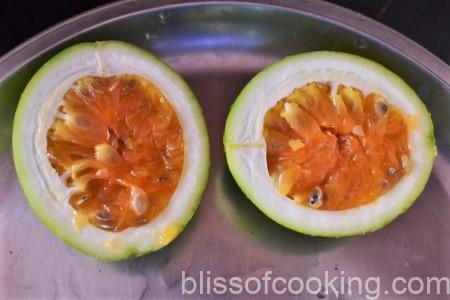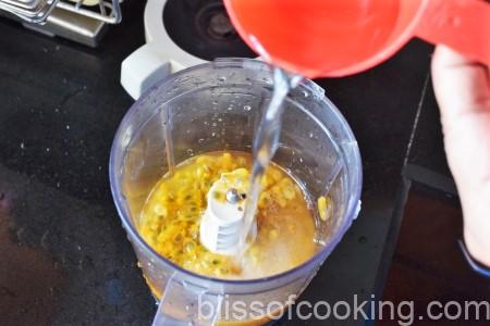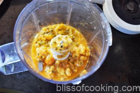 - Cut the passion fruits in half and scoop out the flesh with a spoon.