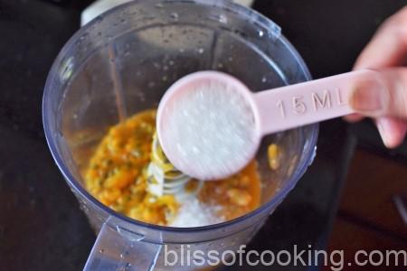 - Add the flesh, sugar or honey and 1 cup water to a blender.