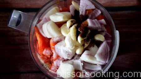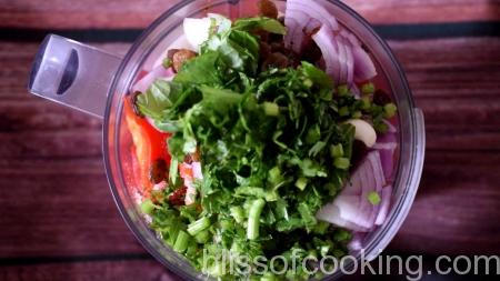 - Combine the sun-dried tomatoes, with tomatoes, pepper, onion, garlic, herbs and spices in a food processor.