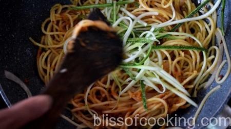 - Add the boiled spaghetti, chilli flakes, salt and toss.