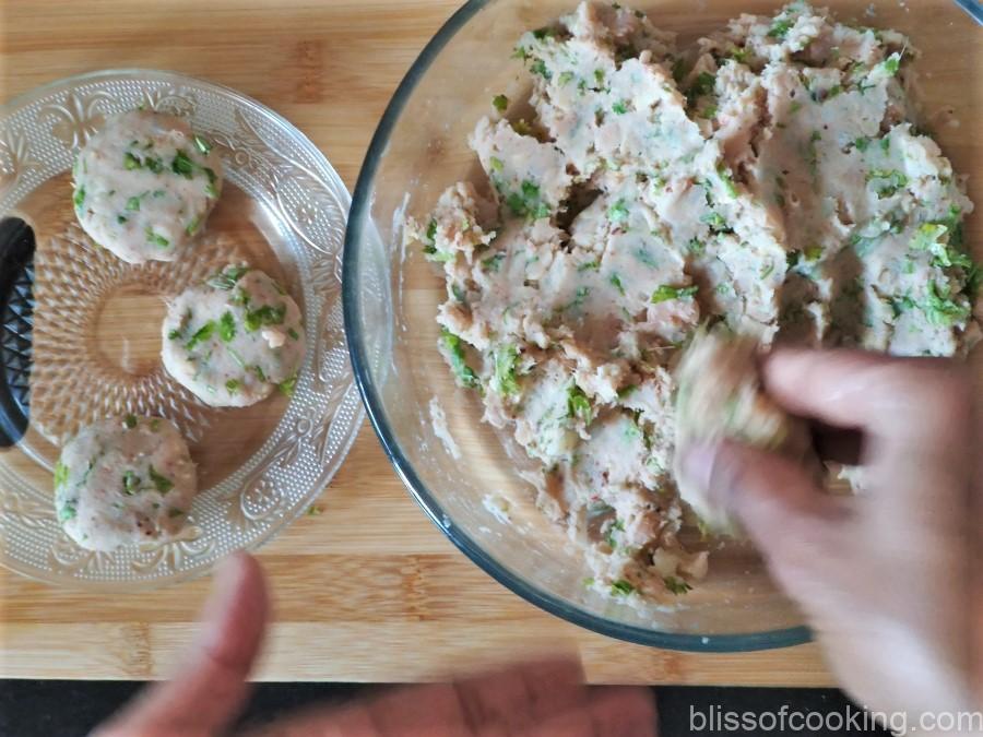• Grease your hands and make the tikki of desired size or shape them as balls.