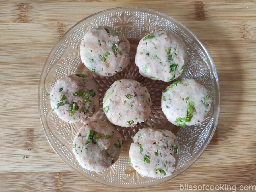 - Grease your hands and make the tikki of desired size or shape them as balls.