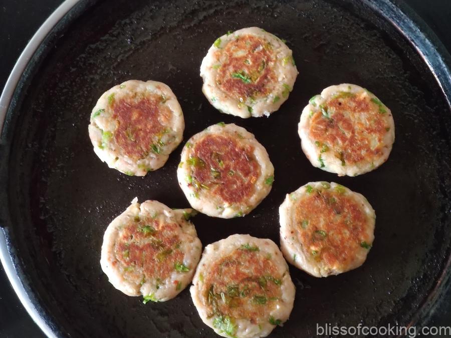 - Pan fry the tikkis on both the side on medium to low heat till crisp. Alternately deep fry till golden or air fry them.
