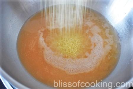 - Place the vegetable stock and 1/2 teaspoon salt in a saucepan and bring it to a boil. Stir in the bulgur, cover the lid, and cook for 2 to 3 minutes on low heat.