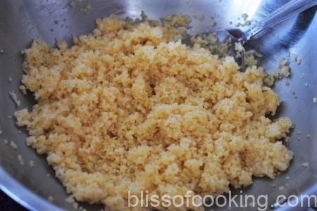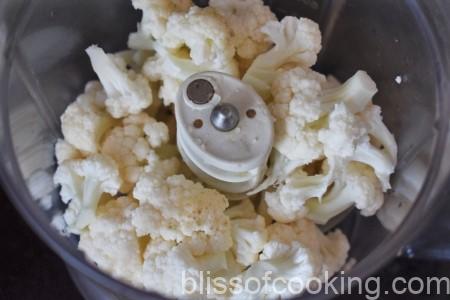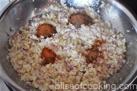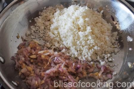 - Add in the cauliflower and saute on high heat till all the moisture evaporates. Switch off the heat and let it come to room temperature.