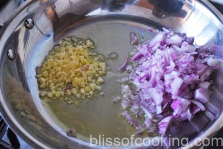 - Heat a spoon oil in a pan; add garlic and onions and saute till translucent.