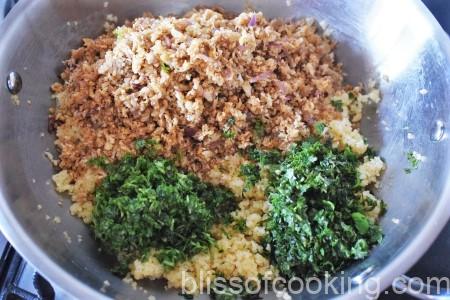 - To the mixing bowl, add your cooked bulgur, cauliflower mix, cilantro, mint, cumin, salt, cinnamon, cayenne papper, five spice powder and lemon juice. Mix to combine well.