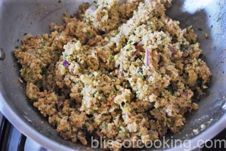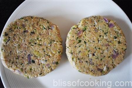 The patties are very well flavored with cinnamon, cumin powder and cayenne/ paprika. I have added a lot of fresh ingredients like mint and coriander leaves. For binding this patty I have used oats in the form of powder, instead of flour or egg.