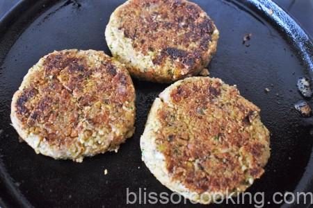 - Heat 1 tablespoons oil in a large cast iron or non-stick skillet over medium heat. Place the patties leaving enough room to flip them. Cook until the patties are golden brown on the underside, about 3 to 4 minutes, then flip, add a splash more oil and cook till golden and evenly cooked.
