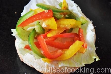 - Cut the bun into two. Apply mayo on both the sides. Place the iceberg lettuce, arrange seasoned peppers, place the patty, spread a spoon of the hummus, a slice of onion and a few tomatoes. Now close with the second half of the bun.