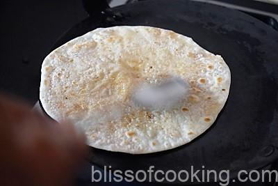 • Heat a griddle, place a roti and flip as soon as small bubbles appear. Apply oil and flip again and apply oil. Cook by pressing with a spatula on high heat. Do not make it crisp.