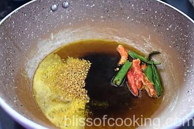 - Heat oil in a pan, add jeera, red chilli, hing and stir.