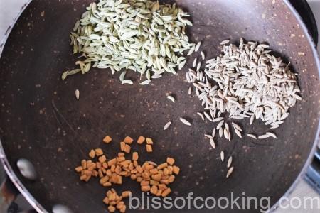 • Dry roast jeera, methi and saunf on low flame. Grind this mixture to a coarse powder and set aside.