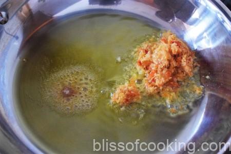 • Add hing, ginger garlic paste and saute till there is no moisture.