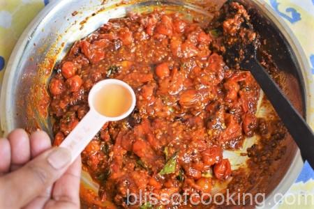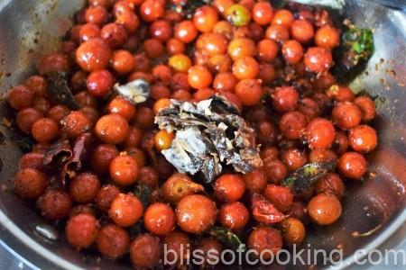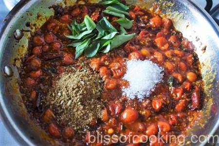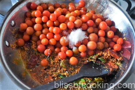 • Add tamarind and stir; cover and cook till the tomatoes are mushy.