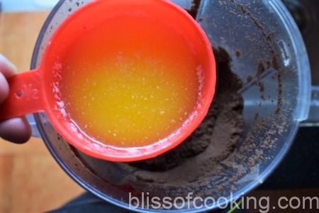 - Transfer the Oreo biscuits, coffee powder in a blender and make a powder. Now add the melted butter and blend again.
