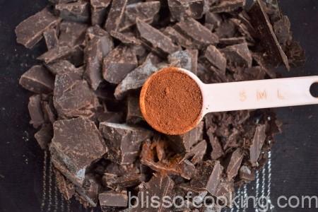 - Grate or chop the chocolate into small pieces and transfer into a glass bowl. Add the coffee powder to it.