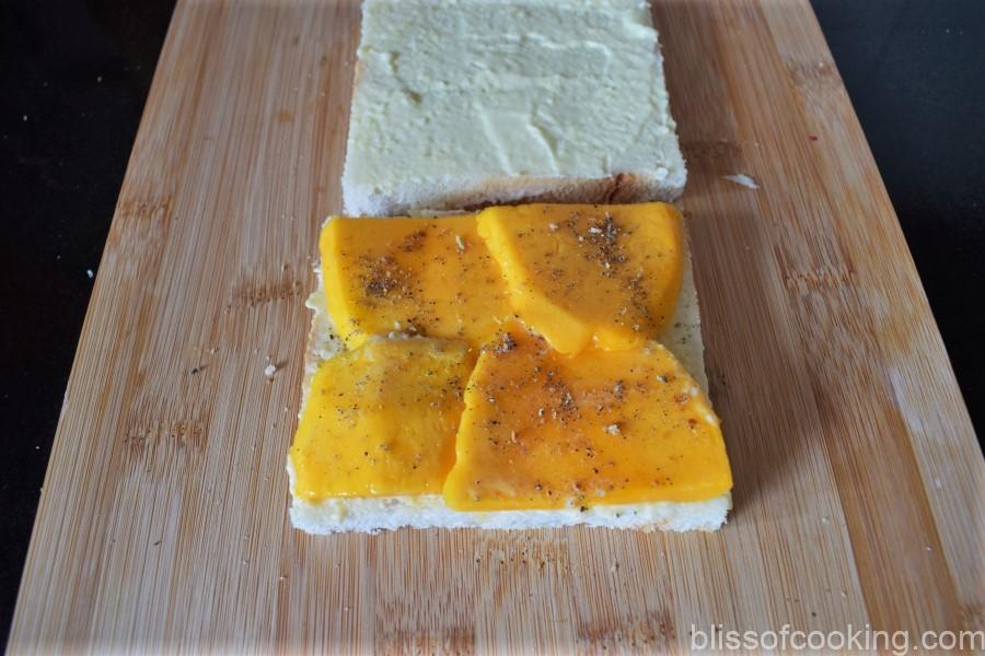 - Arrange a layer of mango slices on creamed bread and sprinkle cardamom.