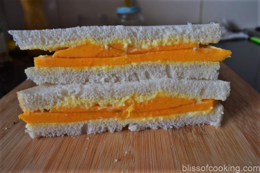 Mango Malai Sandwich is a rich, mouth-melting sandwich recipe. This is a simple and tasty sandwich made with slices of fresh mango placed between the bread slices. A light sprinkle of cardamom powder takes this sandwich a notch higher as mangoes and cardamom pair well. This is a refreshing and delicious breakfast or snack recipe during summer. I added cream (malai) to my normal plain bread recipe and it turned out really soft and tender.